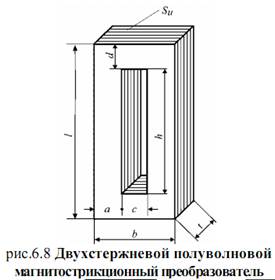 Если подмагничивание отсутствует (рис. 6.7.а), то преобразователь изменяет свою длину с удвоенной частотой 2f и магнитострикционная деформация не велика. При наложении постоянного поля H0, рабочая точка смещается по кривой магнитострикционной деформации (точка С на рис. 6.7.б). В результате чего частота колебаний преобразователя становится равной частоте колебаний поля f и происходит увеличение амплитуда колебаний. Подмагничивание создается или постоянным током, протекающим по обмотке или с помощью постоянных магнитов установленных на магнитопроводе сердечника. Наибольшее распространение получили полуволновые двух стержневые продольно колеблющиеся магнитострикционные преобразователи (рис. 6.8).