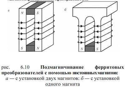 Обмотка возбуждения наносится таким образом, чтобы в соседних стержнях поле было направлено противоположно. Излучение колебаний происходит со стороны накладок, а узел смещения находится посередине стержней. При одностороннем излучении со стороны не работающей поверхности создают отражающий экран – воздушную подушку с помощью пористой резины. В магнитострикционных преобразователях кольцевого типа (рис. 6.9) применяется фтороидальная обмотка. Звук излучается наружной или внутренней цилиндрической поверхности кольца. Для уменьшения потерь на токе Фуко сердечники из металлических материалов набирают из штампованных тонких пластин или навивают из тонкой ленты. Магнитострикционные преобразователи требуют водяного охлаждения. А КПД при частотах 20-30 кГц составляют 50-70%. Магнитострикционные преобразователи изготавливают также из ферритов. Потери на вихревые токи у них практически отсутствуют. Поэтому сердечники из ферритов изготавливаются монолитными. Для их подмагничивания используют пластины ферритовых постоянных магнитов, которые вставляются или вклеиваются в магнитопровод преобразователя (рис. 6.10), их КПД достигает 80-85%. Они не требуют водяного охлаждения. Однако могут излучать акустическую энергию только малой мощности.