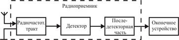 Как видно из представленной структурной схемы приемник состоит из радиочастотного тракта, детектора и последетекторной части. Радиочастотная часть приемника обеспечивает необходимую частотную избирательность, усиление и преобразование сигнала (перенос его на промежуточную частоту).