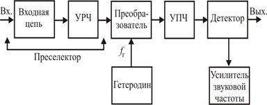 Для устранения недостатков приемников прямого усиления была предложена схема приемника с преобразователем частоты. При этом основное усиление сигнала осуществлялось на промежуточной частоте. Усилитель промежуточной частоты обеспечивает высокую избирательность по соседнему каналу. Перестройка по диапазону осуществляется за счет простых систем перестройки частоты гетеродина и частоты настройки входной цепи. В этом случае частотно-избирательные цепи, включенные до преобразователя частоты, осуществляют избирательность по зеркальному каналу.