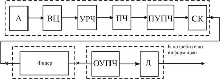 А - антенна; ВЦ - входная цепь; УРЧ - усилитель радиочастоты; ПЧ - преобразователь частоты; ПУПЧ - предварительный усилитель промежуточной частоты; СК -согласующий каскад; ОУПЧ - основной усилитель промежуточной частоты; Д -детектор.