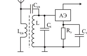 Антенна соединяется с контуром посредством небольшой емкости связи Ссв. Малая величина этой емкости позволяет ослабить вызываемое антенной потерю избирательности и сдвиг настройки контура по частоте. Эквивалентная схема такой входной цепи имеет вид (Рис. 4.27).