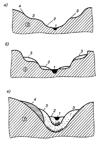 а – эрозионные; б – цокольные; в – аккумулятивные; 1 – русло; 2 – пойма; 3 – первая надпойменная терраса; 4 – вторая надпойменная терраса; 5 – коренные породы.