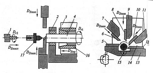 1 — приспособление; 2 — люнет; 3 — шпиндельная бабка; 4 — заготовка (пруток); 5, 6, 8, 10, 12 — резцы; 7, 9, 11, 13 — суппорты; 14 — суппортная стойка; 15— ось; 16— шпиндель; 17 — обработанная деталь;
