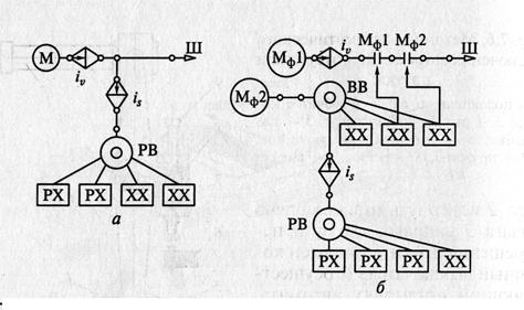 Рис. 4.12. Структурные схемы одношпиндельного автомата продольного точения (а) и токарно-револьверного автомата (б):