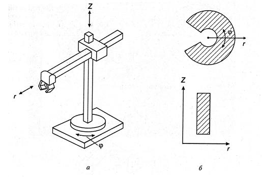 Рис. 7.3.Манипулятор с цилиндрической системой координат (а) и его рабочая зона (б)