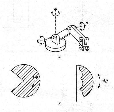 Рис. 7.4. Манипулятор со сферической системой координат (а) и его рабочая зона (б)