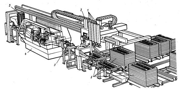 В состав модуля входит ПР 1, оснащенный четырьмя манипуляторами и предназначенный для загрузки - разгрузки станка. ПР способен одновременно взять с транспортно-накопительной системы 6 две заготовки и снять с двух шпинделей станка 4 две обработанные детали.