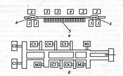 Существуют ГПС, в которых используют несколько КИМ, каждая из которых решает свои задачи. Примером может служить ГПС из станков с ЧПУ (рис. 9.10, б). В технологическую цепочку С6 — С7 — С4 — С5 — СЗ станков с ЧПУ, предназначенных для черновой и чистовой обработки, и станков С1 и С2, предназначенных только для чистовой обработки, включены координатно-измерительные машины М1, М2 и МЗ. Управление технологическим и транспортным оборудованием осуществляется от двух ЭВМ. Обрабатываемые детали перемещаются по конвейеру.
