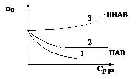 - уменьшают поверхностное натяжение чистого растворителя σ0 и в таком случае их называют ПАВ;