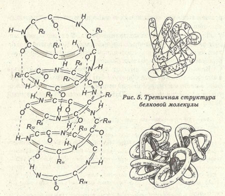 Во вторичной структуре молекула белка имеет вид спирали. Между СО и NH — группами аминокислотных остатков соседних витков спирали возникают водородные связи, удерживающие цепь.