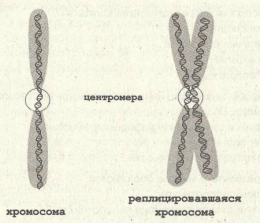 Хромосома представляет собой палочковидную структуру и состоит из двух сестринских хроматид, которые удерживаются центромерой в области первичной перетяжки. Каждая хроматид а построена из хроматиновых петель. Хроматин не реплицируется. Реплицируется только ДНК.