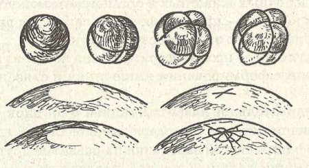 Рис. 17. Начальные стадии дробления яйцеклеток лягушки (вверху) и птицы (внизу)