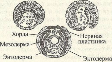 • гаструлы — стадии образования зародышевых листков — эктодермы, энтодермы (у двухслойных) и мезодермы (у трехслойных). Процесс образования гаструлы называют гастру-ляцией. Впячивание бластодермы (инвагинация) приводит к образованию первичной кишки — гастроцели, вход в которую называют гастропором. У первичноротых гастропор превращается в ротовое отверстие. У хордовых (вторичноротых)