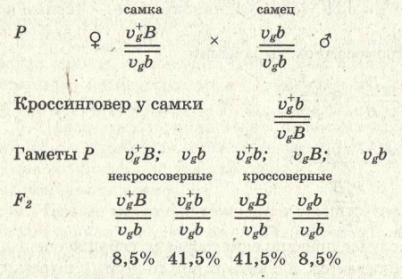 Данные результаты свидетельствуют о наличии сцепления генов и кроссинговере между ними. Так как в потомстве от второго скрещивания было получено 17% рекомбинант-ных особей, то расстояние между генами Vg и В равно 17%, или 17 морганидам.