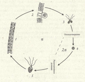 Рис. 24. Жизненный цикл улотрикса: 1 — участок вегетативной нити; 2 — образование гамет;