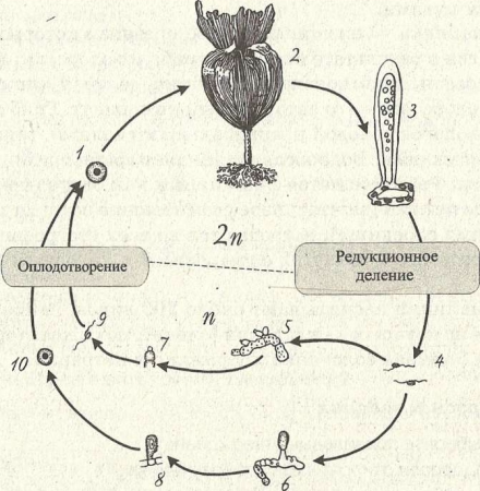 Рис. 25. Жизненный цикл бурой водоросли (ламинарии): 1 — зигота; 2 — спорофит; 3 — спорангий; 4 — споры; 5 — мужской гаметофит; 6 — женский гаметофит; 7 — антеридий; 8 — архегоний; 9 — сперматозоид; 10 — яйцеклетка