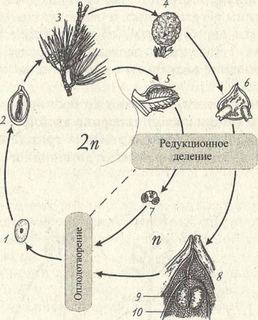 3 — спорофит; 4 — женская шишка; 5 — мужская шишка; 6 — семенная чешуя с семяпочками); 7,8 — развитие гаметофита (7 — микроспора; 8 — верхняя часть семяпочки); 9 — яйцеклетка; 10 — эндосперм