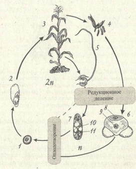 Рис. 29. Жизненный цикл покрытосеменных: 1 —5 — развитие спорофита (1 — зигота; 2 — зародыш семени; 3 — спорофит; 4 — тычиночный цветок; 5 — разрез пестика с семяпочкой); 6,7 — развитие гаметофита (в — пыльца (мужской заросток); 7 — зародышевый мешок); 8 — ядро генеративной клетки;'9 — ядро вегетативной клетки; 10 — центральное ядро (2 n); 11 — яйцеклетка