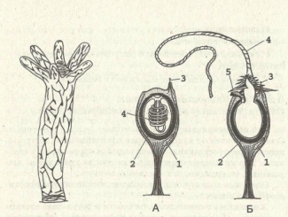 1) наличие стрекательных клеток во внешнем слое. Они развиваются из промежуточных и состоят из стрекательной капсулы, наполненной жидкостью, и стрекательной нити, помещенной в капсуле. Стрекательные клетки служат орудием нападения и защиты;