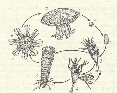 Рис. 34. Развитие сцифомедузы: 1 — яйцо; 2 — планула; 3 — одиночный полип; 4 — почкующийся полип; 5 — делящийся полип; 6 — молодая медуза; 7 — взрослая медуза