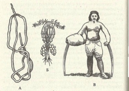 Рис. 35. Нитчатки — паразиты человека. А — ришта (Dracunculus medinensis) — взрослая самка; Б — личинка ришты в циклопе (по Павловскому); В — слоновая болезнь (элефантиазис), причиненная нитчаткой Банкрофта (по Брумпту)