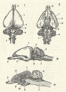 Рис. 38. Мозг кролика: I — сверху; II — снизу; III — сбоку; IV — продольный разрез. 1 — большие полушария; 2 — обонятельные доли; 3 — зрительный нерв; 4 — эпифиз; 5 — средний мозг; 6 — мозжечок; 7 — продолговатый мозг; 8 — гипофиз; 9 — варолиев мост; 10 — мозговая воронка; 11 — мозолистое тело