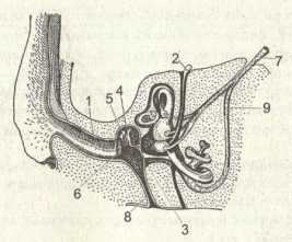 Рис. 39. Схема органа слуха млекопитающего: 1 — наружный слуховой проход; 2 — эндолимфатический канал; 3 — круглое окно; 4 — наковальня; 5 — молоточек; 6 — барабанная перепонка: 7 — слиховой нерв: 8 — евстахиева триба: 9 — нерв улитки