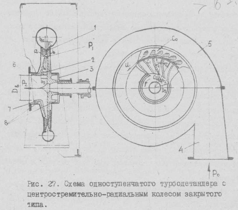 | Рис. 2. Схема одноступенчатого турбодетандера с центростремительно-радиальным колесом закрытого типа. |
