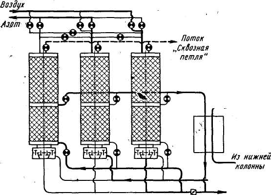 В регенераторах с насыпной насадкой сближение температур в зоне вымораживания СО2 может происходить либо при отборе части воздуха из середины регенератора (способ а), либо при подогреве петлевого потока s змеевиках, встроенных в нижнюю часть регенератора. При наличии встроенных змеевиков в качестве петлевого потока может быть воздух, прошедший через регенератор (прямой поток), или азот из нижней колонны (рис. 6). Петлевой поток проходит по змеевикам обоих регенераторов непрерывно в течение всего цикла. В регенераторах со встроенными, змеевиками может быть организована так же, как и в регенераторах с тройным дутьем, «сквозная петля».