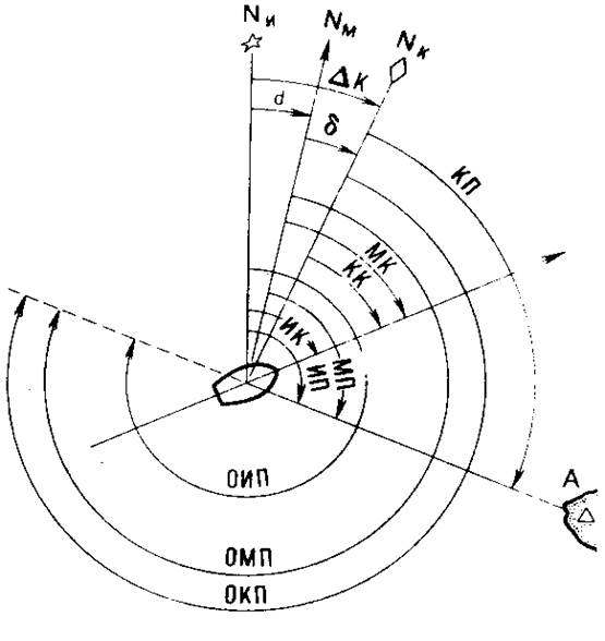 Компасный, гирокомпасный пеленг (КП,ГКП)—угол между северной частью компасного (гироскопического) меридиана и направлением на объект.