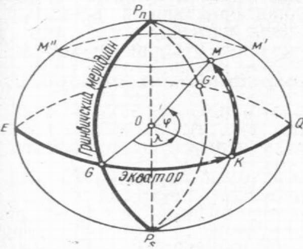 Долгота — двугранный угол между плоскостями нулевого (гринвичского) меридиана и меридиана наблюдателя (точки М). Этот угол измеряют меньшей дугой экватора (но не параллели), заключенной между указанными меридианами, от 0 до 180° в обе стороны от начального (гринвичского) меридиана. Так, долгота точки М (см. рис. 2 и 3) измеряется дугой экватора GK.