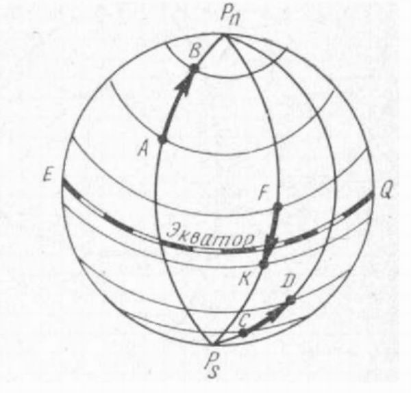 В примерах 1, 2 и 3 для простоты рассуждений пункты отхода и прихода расположены на одном географическом меридиане, т. е. имеют одну и ту же долготу. На рис. 5 стрелкой показаны направления движения судна и сделанные им разности широт.