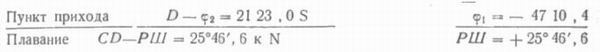 Пункт отхода С — φ1 = 47°10', 4 S по формуле (4) φ2 = — 21°23', 0