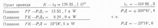 Пункт отхода F — λ1 =164°06',3 W по формуле (5) λ2 = + 170°35',1