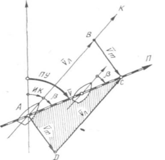 Если плавание происходило на постоянном течении, то судно в продолжение того же часа подвергалось влиянию этого течения и таким образом получило дополнительное перемещение, которое на рисунке изображено вектором BC—Vт, образованным элементами течения.