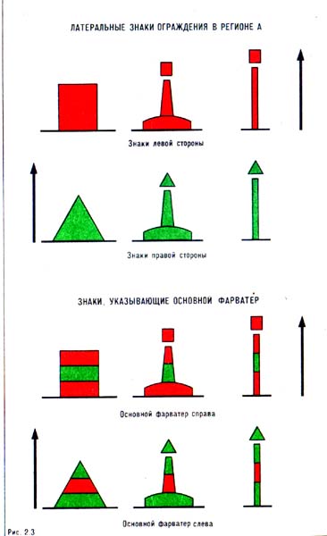 В регионе Б на латеральных знаках (рис. 2.4), выставляемых на левой и правой сторонах фарватера, зажигаются соответственно зеленые и красные огни.