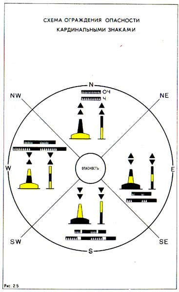 Вид и окраска кардинальных знаков и характеристика их огней показаны на рис. 2.5.