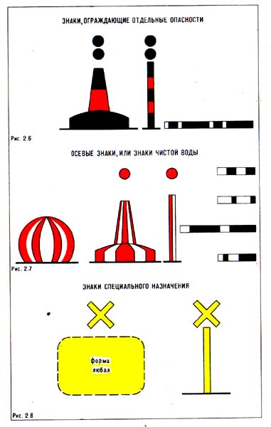 Осевые знаки, или знаки чистой воды (рис. 2.7), служат для обозначения оси фарватера или в качестве подходных. Они представляют собой буи сферической или столбовидной формы и вехи с топовой фигурой в виде красного шара.
