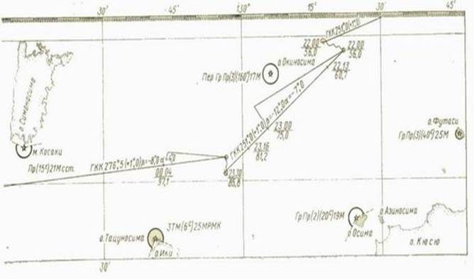 После нанесения выбранного пути судна на карту (карты) на каждой линии курса пишут число градусов и число миль плавания данным курсом — ИК и S.