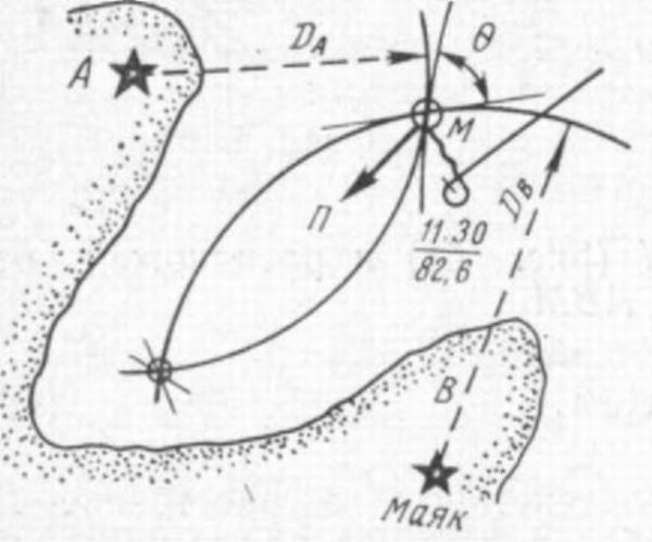Измерив тем или иным способом расстояние до двух береговых предметов, проводят две линии положения в виде окружностей, пересекающихся в двух точках. Место судна определяют измерением третьего расстояния, приближенным пеленгом или ориентировкой на счислимое место, находящееся обычно вблизи обсервованного (рис. 49). Точность определения судна можно проверить формулой(1)