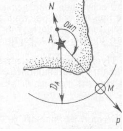 Если виден только один предмет, то место судна определяют путем измерения направления и расстояния до него. Для этого прокладывают пеленг наблюдаемого предмета, затем из положения предмета на карте описывают окружность радиусом, равным измеренному расстоянию. Место судна получают в точке пересечения пеленга и окружности (рис. 50). Точность определения места судна оценивают формулой