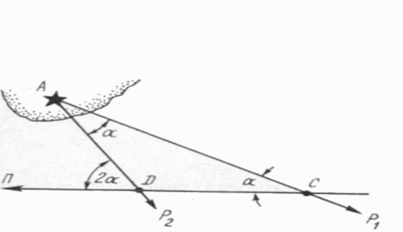 1. Двойной угол. Если при первом наблюдении заметить угол АСП = а (рис. 52), а второе провести в момент, когда истинный пеленг Р2 составит с направлением движения судна угол ADП=2a, то образовавшийся треугольник ACD будет равнобедренным (AD = CD). Поэтому в момент второго наблюдения судно будет находиться на линии второго пеленга и на расстоянии от пеленгуемого предмета, равном величине плавания за промежуток времени между наблюдениями.