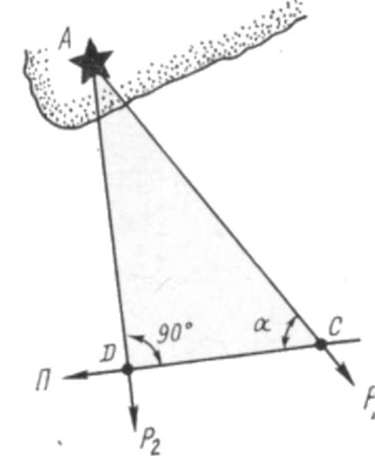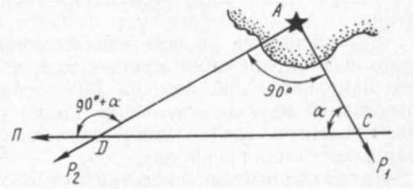 2. Траверзное расстояние. При первом наблюдении замечают угол АСП = а (рис. 53), а второе производят в тот момент, когда предмет будет находиться на линии Р2, перпендикулярной линии пути. Тогда из треугольника ACD