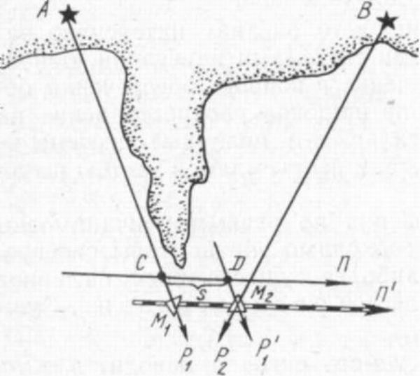4. Разновременные пеленги двух предметов (рис. 55). Если с судна виден предмет А, который невозможно запеленговать дважды, то перед его скрытием берут пеленг Р1 замечая по судовым часам время и показания лага.