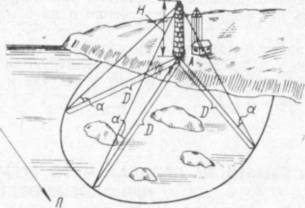 даст возможность получить величину угла а по формулам (47) и (48). Этот угол называют вертикальным углом опасности. До тех пор, пока измеряемая с судна угловая высота в предмета А меньше вертикального угла опасности а, путь судна не пересечет ограждающей окружности. Угловую высоту измеряют секстаном.