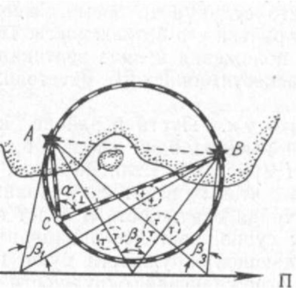 Горизонтальный угол опасности. Пусть с судна видны два предмета А и В (рис. 68). Если описать окружность, которая проходит через эти предметы и охватывает прибрежные навигационные опасности, такая окружность также будет ограждающей линией положения, а путь судна П, не пересекающийся с данной окружностью, — безопасным путем.