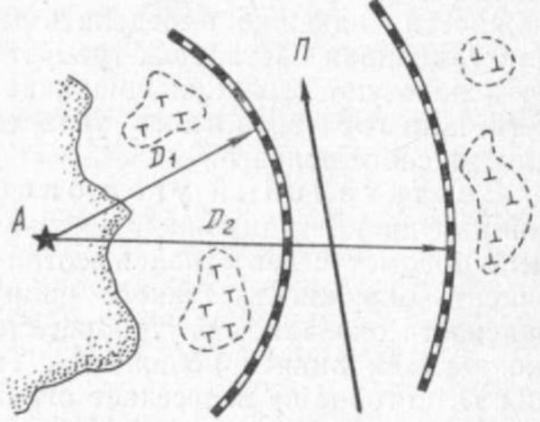 Опасное расстояние. Если можно измерить расстояние до предмета дальномером или радиолокатором, с карты снимают опасное расстояние до предмета, при котором судно проходит чисто все прибрежные опасности. В дальнейшем следят за тем, чтобы измеряемое с судна расстояние всегда было большим или меньшим (в зависимости от обстановки), чем опасное расстояние. Из рис. 69 видно, что для безопасного прохода между опасностями в данном случае необходимо, чтобы измеряемое с судна расстояние до предмета А было больше D1, но меньше D2.