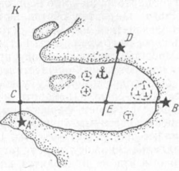 Опасный пеленг. При подходе к берегу часто пользуются ограждающим пеленгом предмета, который называют опасным. Следуя в направлении КС (рис. 70), делают поворот в тот момент, когда пеленг на предмет В совпадает с линией ВС; при следовании в направлении СВ поворот к месту якорной стоянки делают лишь после того, как пеленг предмета D совпадет с линией DE. Этот способ можно использовать лишь в том случае, если правильно учтены общая поправка компаса, снос от ветра и течения.