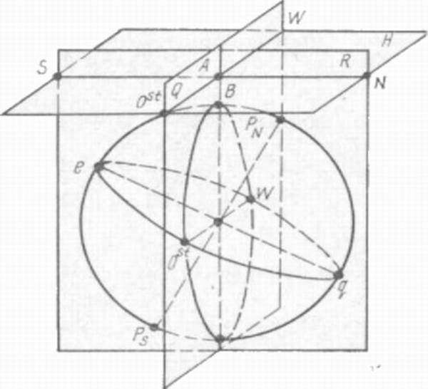 Горизонтальную плоскость, проходящую через глаз наблюдателя, называют плоскостью истинного горизонта наблюдателя (плоскость Н). Вертикальную плоскость, проходящую через глаз наблюдателя и земные полюсы, называют плоскостью истинного меридиана наблюдателя (плоскость R). Пересечение этой плоскостью земного шара дает в сечении большой круг BPnqPse, окружность которого называют меридианом места, или меридианом наблюдателя.